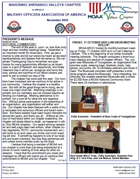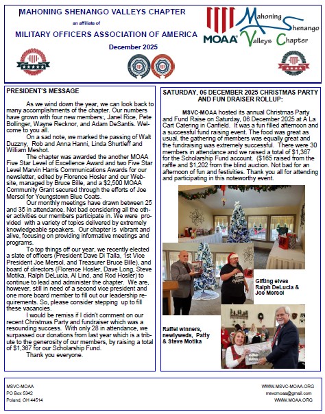 The Mahoning Shenango Valleys Chapter (MSVC) is an affiliate of the Military Officers Association of America (MOAA).